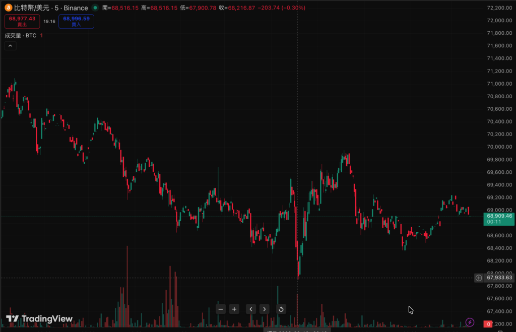 加密货币持续走弱,没看到回弹迹象,比特币自昨晚2240跌破67900,半夜一点一度叩关70000美元未突破,现収69042美元。