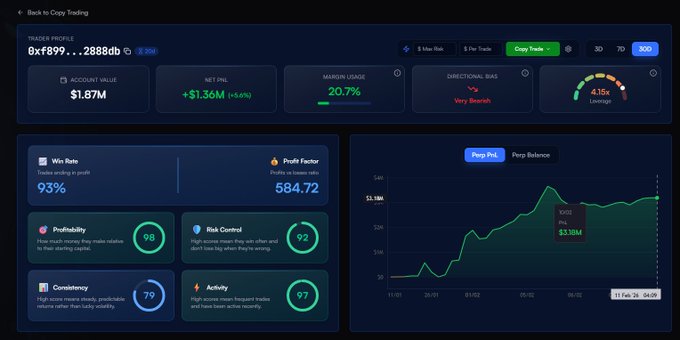 智能钱包 0xf899 通过做空 $BTC、$ETH 和 $SOL 获利 1,360,000 美元,平均杠杆为 4 倍。 该钱包的密码评分为 97/100,能够持续准确地把握市场趋势。 使用密码零延迟跟单交易,轻松发现并复制表现最佳的钱包。
