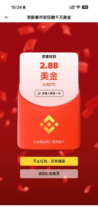 要过年了 骂了这么久 两大交易所开始撒钱了 @binancezh @okxchinese 币安的我抢了 2.88 ,有人抢到挺大的,几十上百刀, @heyibinance 有意思的是,币安的直接抢就行了,okx还得做交易任务😂,高下立判啊这,没必要吧star老板 @star_okx