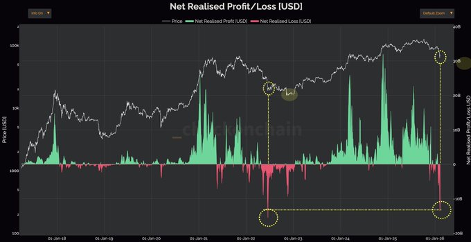 🚨重磅讯息:#比特币 已实现亏损达到熊市极端水平💥 比特币净已实现亏损目前已与2022年熊市最严重时期的水准相当。 就在3天前,已实现亏损高达136亿美元。 📉 然而,值得注意的是: 🔹 2022年的亏损高峰出现在市场实际触底前约5个月 🔹 底部形成需要时间