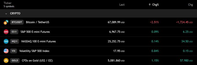 $BTC 今日跌破 67,000 美元关口。 美国股指期货在公布美国失业率数据前依然上涨。 盘前股票交易简报: ▫️纳斯达克期货上涨 0.14% 🟠 ▫️标普 500 指数期货上涨 0.09% 🟠