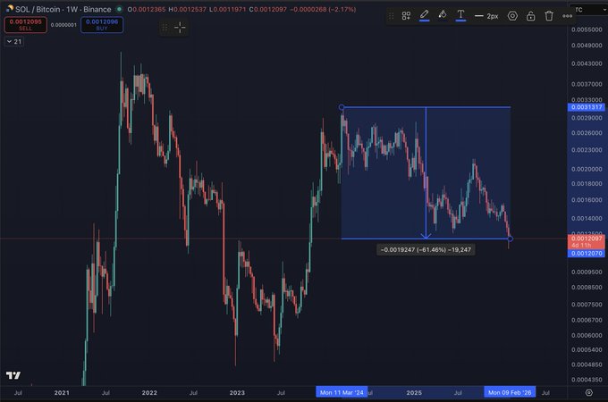 # SOL / # BTC在本轮周期内下跌了 61%。 大多数山寨币最终都会遵循类似的模式。 在加密货币领域待得足够久,你就会无数次看到这种模式。