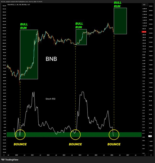# BNB 每次随机指标 RSI 在下行区域反弹时, BNB都会出现一波上涨行情。 它目前在该区域波动。 免责声明: 从历史上看,类似的反弹往往与牛市行情同时发生,但过去的模式并不能保证未来的走势。