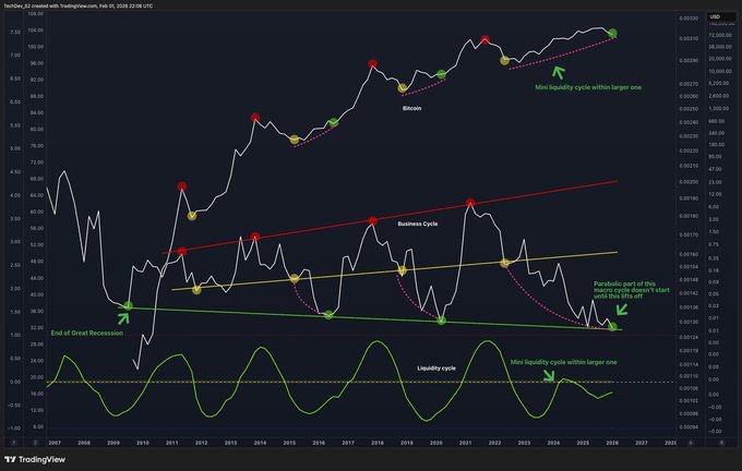 这是#加密货币 和 #比特币 领域最好的图表。 没有比这张图表更能解释当前市场状况的了。 我的论点: - 市场已于 2024 年 12 月见顶。 - 市场正在本月触底。 - 2026 年和 2027 年将迎来强劲的牛市。 主要理由是,市场与整体宏观经济行为密切相关。 加密货币不再独立运行,它与所有其他市场息息相关,并被视为一种风险资产。事实上,它是一种风险极高的风险资产。 这正是过去一年市场表现糟糕且令人困惑的主要原因。 2025 年本应是市场迎来巨大增长的一年。 从根本上讲,这种情况确实已经发生,但讽刺的是,价格尚未跟上这一趋势。 稳定币的普及率呈垂直增长。同样的情况也发生在 2019/2020 年,在此期间,$ETH 一直没有波动。 直到它开始波动,真正的投资回报率才开始显现。 为什么市场没有飙升?为什么它们不断暴跌? 这归根结底有几个原因。 资产管理公司将资金配置到黄金和白银,发现这些市场的波动性飙升,为了平衡风险参数,他们被迫出售其他资产。 一旦黄金和白银的波动性下降,资金配置就会更多地转向比特币。 此外,宏观经济形势也不乐观。 如图所示,商业周期正处于过去十五年来的最低点,并且刚刚经历了加密货币历史上最长的熊市。 这导致所有山寨币持有者都将经历一段漫长的痛苦时期。 真是糟糕透了。 然而,图表也显示,市场即将迎来上涨趋势。 每当商业周期和流动性达到如此水平时,风险资产(例如山寨币和比特币)的市场就会开始上涨。 2024 年是精彩的一年。山寨币表现出色,我们经历了“模因币”的狂欢。 然而,这仍然是一轮非常短暂的牛市,因为流动性在这一年中并未出现激增。 接下来会发生什么? 比特币尚未出现飙升,甚至远未达到。没有出现狂热,也没有出现欣喜若狂。什么都没有。 最重要的是:随着黄金近期的上涨,价格上限已显著提高。 比特币获得上涨动力只是时间问题,因为它与黄金走势密切相关。 接下来的几个月对市场而言至关重要。最值得关注的是宏观经济因素: - 黄金和白银价格停滞不前,波动性下降 = 对比特币有利。 - 美国经济数据疲软 = 收益率下降 = 利率下降 = 美联储增发货币 = 对比特币有利。 - 日本国债收益率下降 = 对比特币有利。 这些是需要关注的核心指标,说实话,我认为我们目前的形势一片大好。 别人贪婪时我恐惧,别人恐惧时我贪婪。 图表由 @TechDev_52 提供。