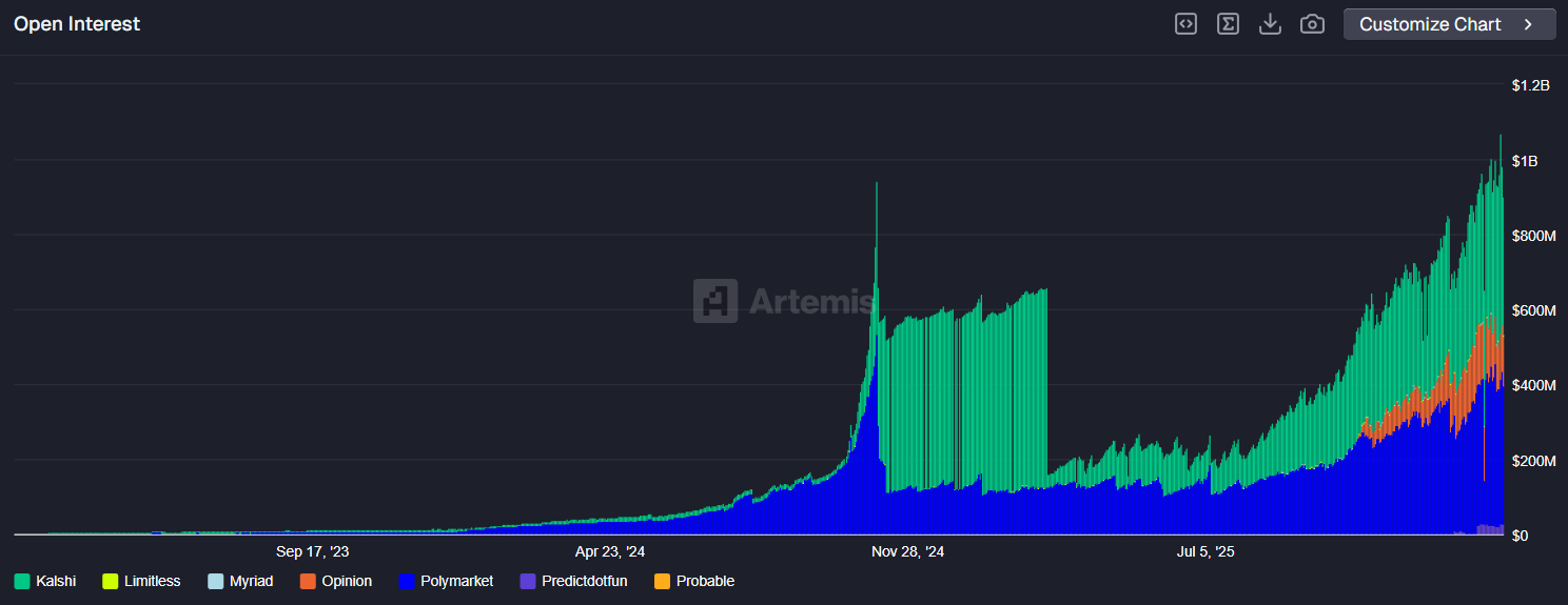 根据 Artemis 的数据,2 月 7 日,包括Polymarket 、 Kalshi 、Limitless、Opinion 等平台在内的所有交易平台的未平仓合约总额首次突破 11 亿美元,创下历史新高。未平仓合约总额反映了所有当前活跃仓位的价值——在本例中,指的是所有预测中“是”或“否”的仓位——这些仓位尚未结算,因此它是衡量资金流入和流动性的重要指标。