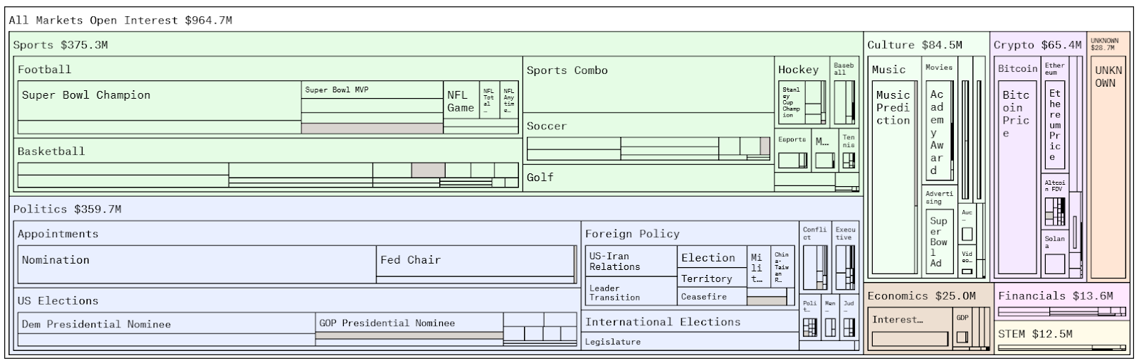 根据加密风险投资公司 Paradigm 的新仪表盘的数据,深入分析用户下注最多的领域,体育以 3.753 亿美元位居榜首,政治紧随其后,达到 3.597 亿美元,文化领域则为 8450 万美元。该仪表盘追踪 Polymarket 和 Kalshi 这两个按未平仓合约量和交易量计算最大的市场中各个领域的流动性。