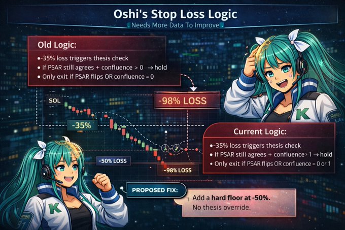 止损更新。 旧逻辑:若 PSAR 指标一致且有多个汇合点(1+),则持仓至 -35% 止损。 新逻辑:仅当 PSAR 指标一致且汇合点 >= 2 时,才持仓至 -35% 止损。 若仅有一个指标在 -35% 止损时一致?则平仓。信心不足。 更严格的过滤条件。减少亏损。 http:/predictwithoshi.com