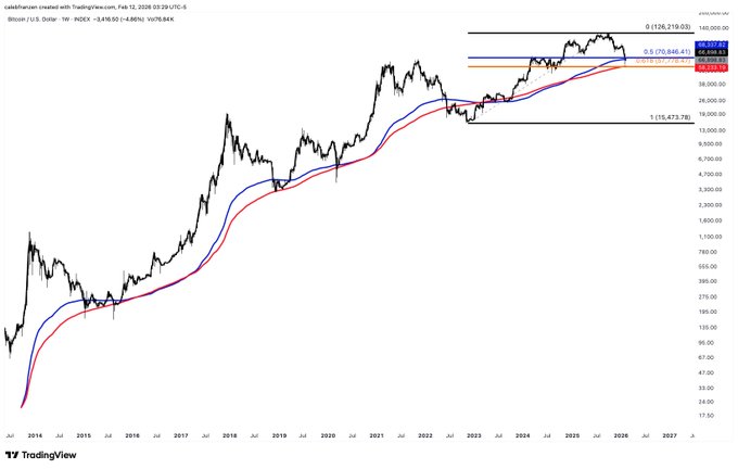 比特币价格在 9.7 万美元时,我说过它进入了新的熊市。 在 9.7 万美元时,我说过每一次熊市都会重新测试其 200 周移动平均线。 在 9.7 万美元时,我说过我会在 200 周移动平均线云图回测时买入。 现在……将近三个月过去了,我们来到了这里…… 在 200 周移动平均线云图上。 所以我买入了比特币。