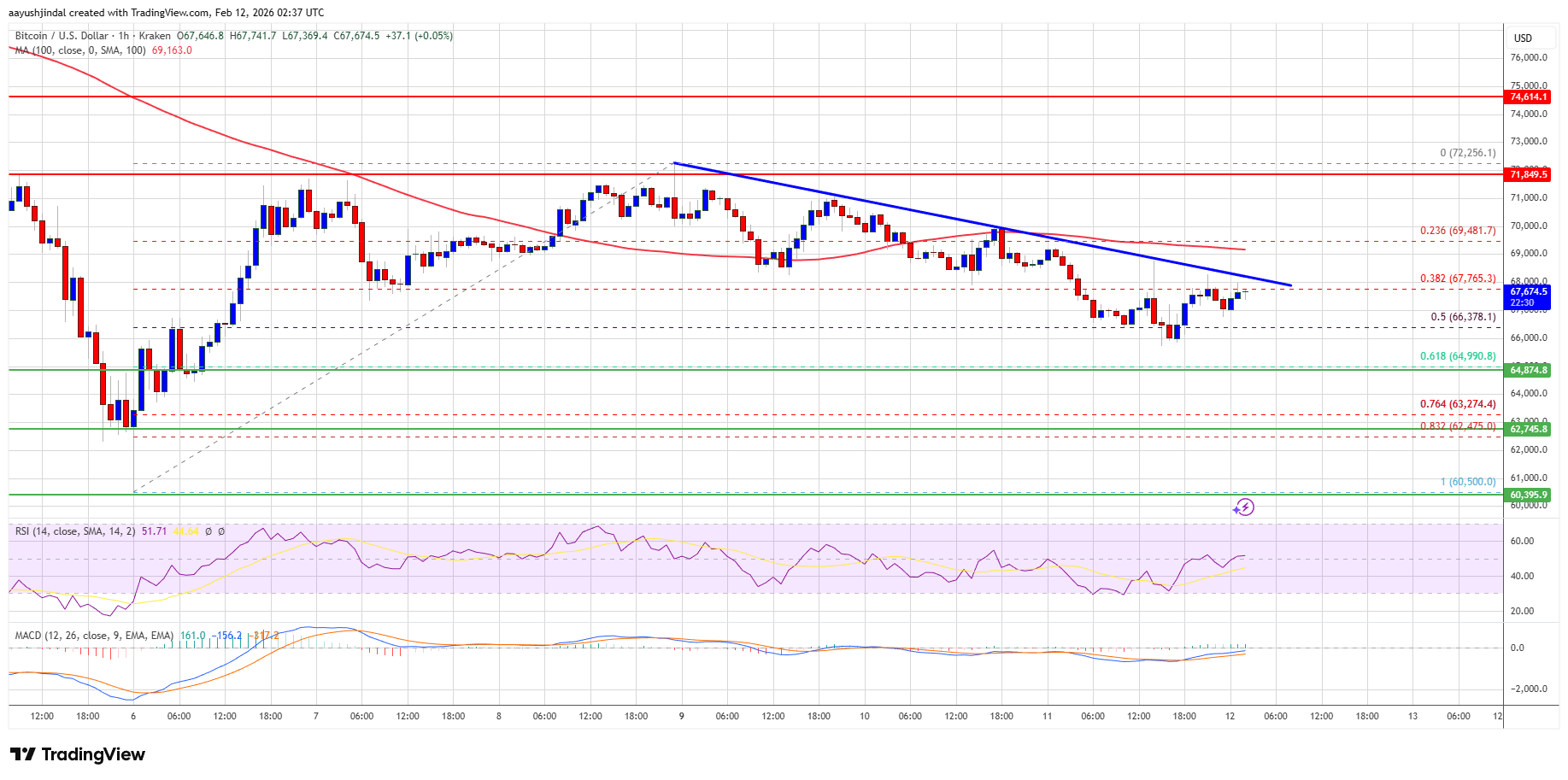 价格跌破了从 60,500 美元低点到 72,256 美元高点上涨行情的 50% 斐波那契回撤位。此外,在BTC /USD 小时图上,一条阻力位在 68,200 美元的下降趋势线正在形成。
