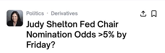 自发布这条推文以来,Polymarket 又推出了一种新的衍生品:朱迪·谢尔顿(Judy Shelton)周五前股价达到 5% 的概率。链接如下。