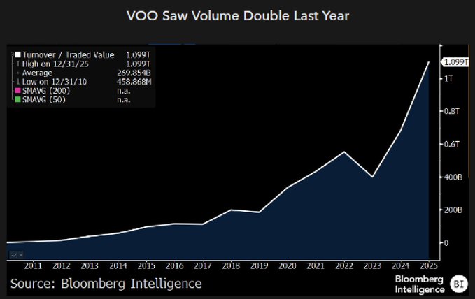 值得关注的一点是 $VOO 的交易量。它去年的交易量首次突破 1 万亿美元,几乎是前几年的两倍,与 IVV 的交易量持平。当然,SPY 的交易量遥遥领先,10 年前 SPY 的交易量是 VOO 的 66 倍,但去年仅为 11 倍。我和我的团队对此进行过讨论,但我认为 VOO 最终也会成为流动性最强的 ETF——甚至可能在 5 年内实现。让我们拭目以待。