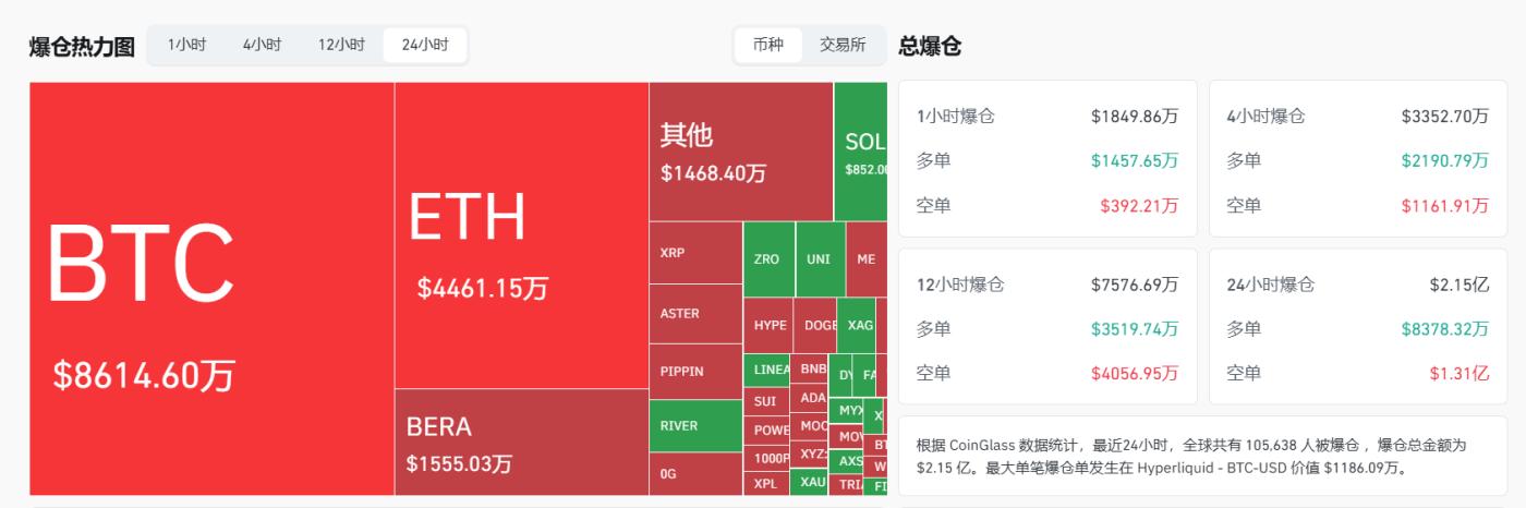 BTC 爆仓金额达 8614.60 万美元,ETH 爆仓 4461.15 万美元。过去 24 小时内共有 105,638 人被爆仓,最大单笔爆仓出现在 Hyperliquid 的 BTC-USD 交易对上,价值 1186.09 万美元。