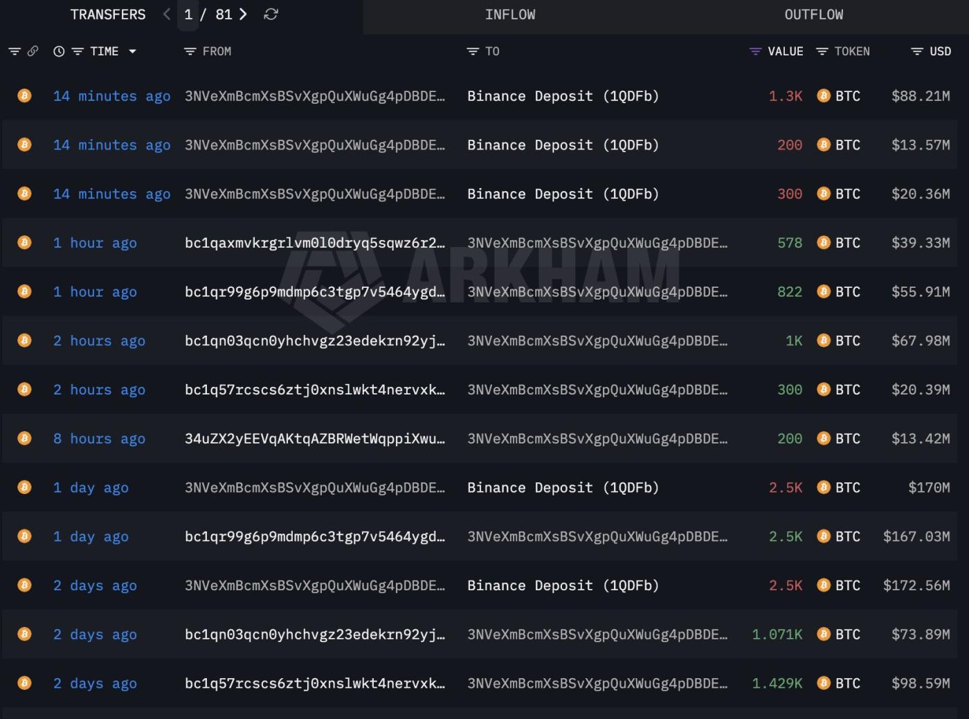 该地址昨日曾向交易所出售 5,000 枚比特币,价值约 3.43 亿美元。