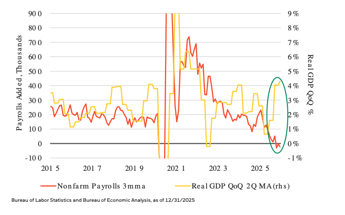本轮经济周期的异常之处在于,经济成长在缺乏典型劳动密集特质的情况下依然保持稳定。 2025年最后两个季度,实质GDP平均成长率可能超过4%,但就业成长却为负值。