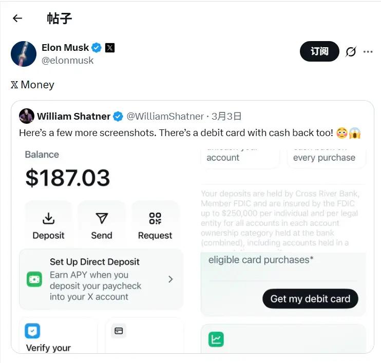 ChainCatcher 消息,马斯克转帖暗示网传 X Money 内部测试截图为真,图中显示 X Money 提供高达 6% 存款年化收益,还包含附带返利的借记卡功能。