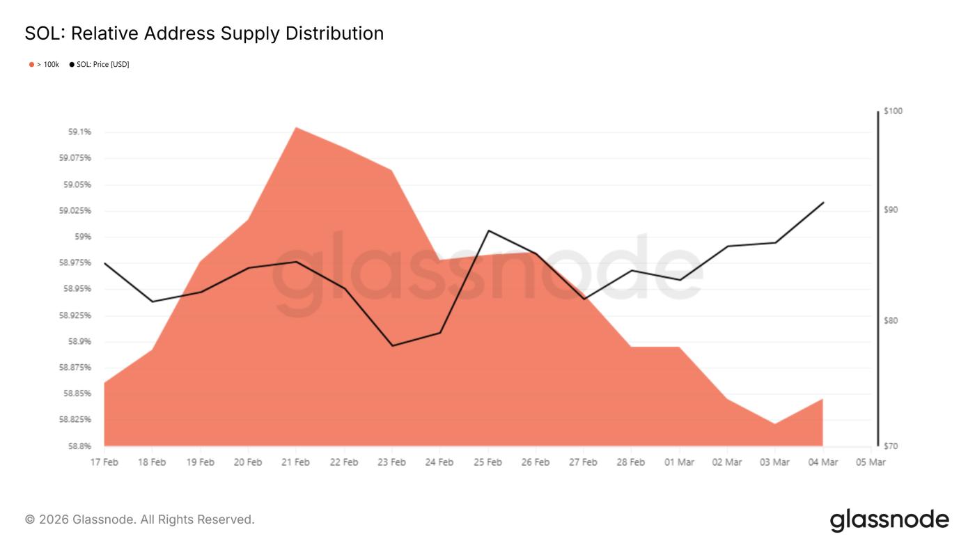 从宏观层面来看, Solana的供应分布也发生了变化。持有超过10万枚SOL的巨鲸群体的主导地位略有下降。过去两周,他们在总供应量中的份额从59%降至58.6%。巨鲸的抛售可能表明他们对当前的价格走势持怀疑态度,因为这些大户正在逢高卖出。