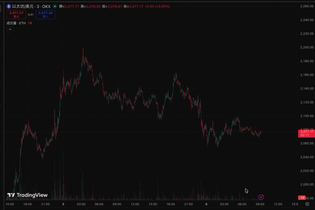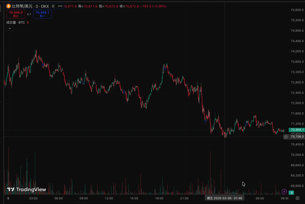Toggle比特币昨夜从 72,300 美元一路下探,凌晨 1 时跌至日内低点 70,658 美元,下跌幅度约 2.3%,今早小幅回稳至 70,923 美元,仍在 71,000 美元整数关口之下盘旋。以太坊在本波行情中展现难得的相对强势:昨夜自 2,134 美元下滑,最低触及 2,055 美元打底,今早已回升至 2,073 美元,日内跌幅约 2.9%,盘中并未出现跟随比特币进一步下挫的情形。