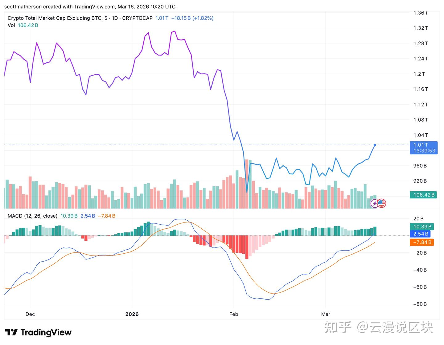 当前周期呈现出截然不同的景象。美联储净流动性指标在过去两年中大部分时间处于区间震荡,波动幅度较大,缺乏明确的方向性趋势。与此同时,采购经理人指数(PMI)在此期间大部分时间处于收缩状态,连续26个月低于50,直到2026年1月才恢复扩张。其他行业指数(OTHERS index)忠实地反映了这些状况,一直横盘整理,没有出现山寨币行情所需的上涨行情。