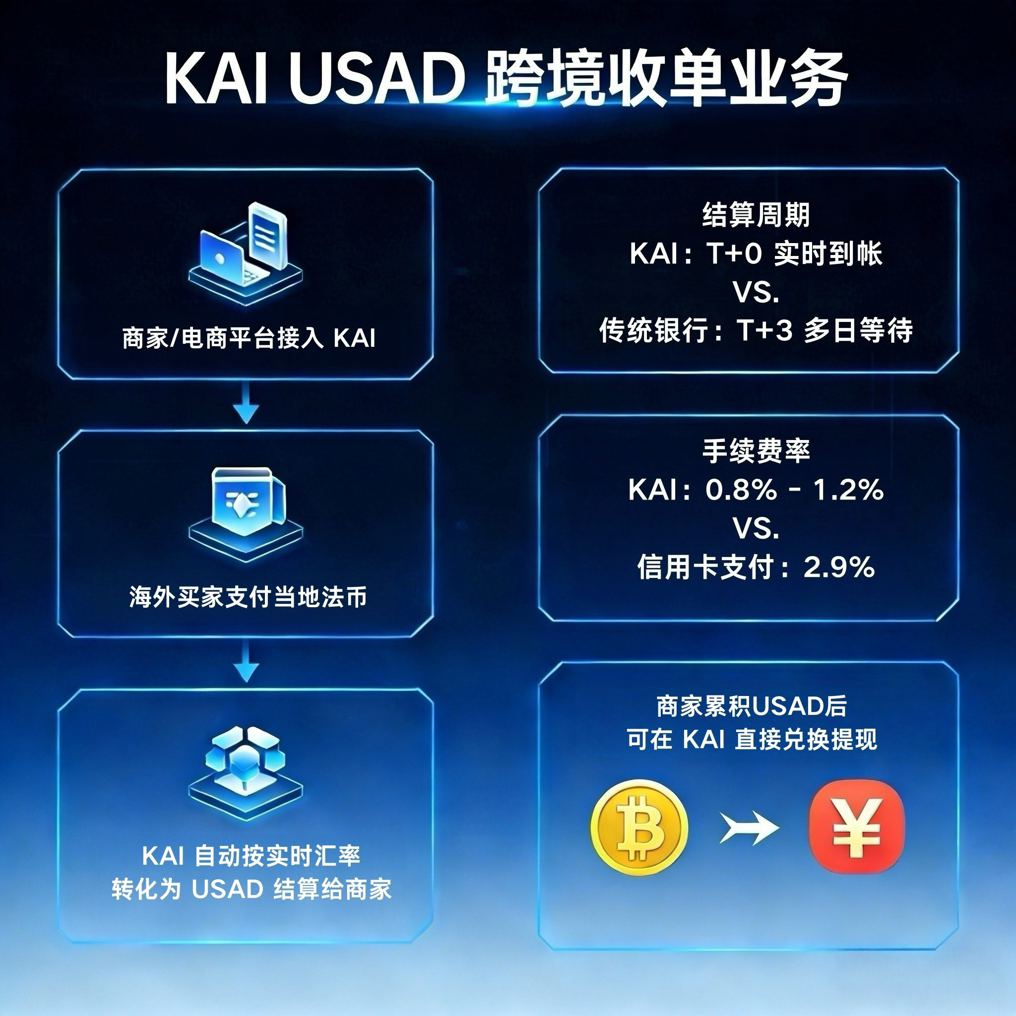 基于 KAI 的跨境支付结算业务,商家或电商平台接入 USAD 后,海外买家无论使用法币还是加密货币支付,系统都可按照实时汇率自动完成清算,并直接以 USAD 形式结算给商家。相比传统银行体系普遍需要 T+3 才能完成清算,KAI 实现了 T+0 即时到账,极大缓解了商家的现金流压力,也让跨境业务周转效率显著提升。