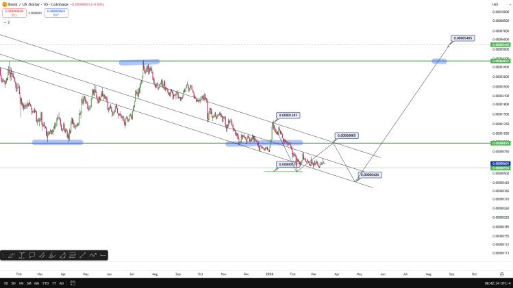另一种似乎正在吸引分析师关注的模因币是BONK,它是Solana平台上领先的模因币之一。与同类币种一样,BONK的价格较历史最高点下跌了约90%,但仍持续获得社区的支持。