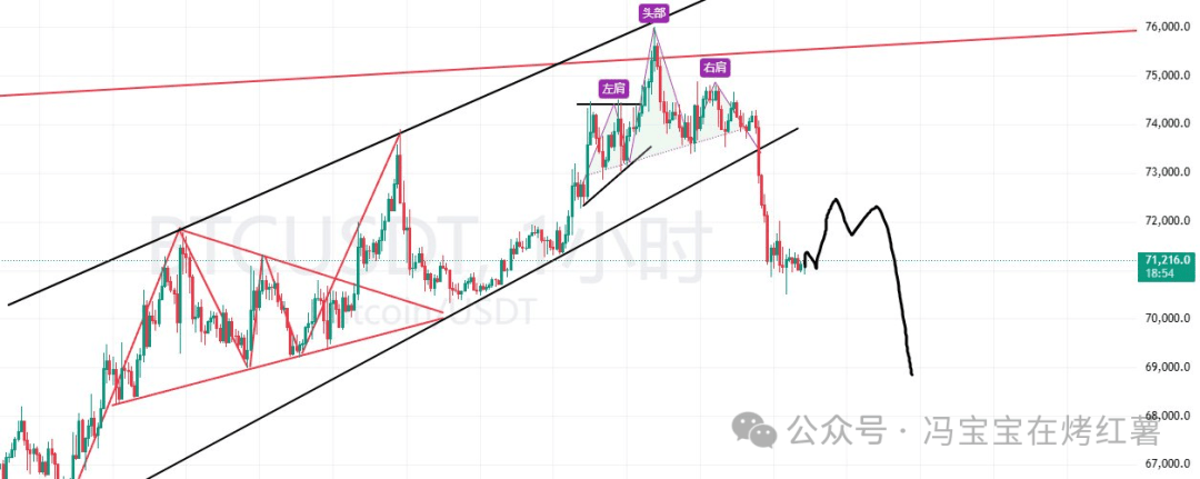 价格跌破上升通道后,直接快速暴跌了四五千点,现在已经到第一支撑位7万附近。第一波急跌到位,接下来大概率要走个下跌中继。后面如果反弹到7.25–7.3万可以继续做空。要是跌破6.9–7万这个支撑区,下一目标就看到6.5万了。