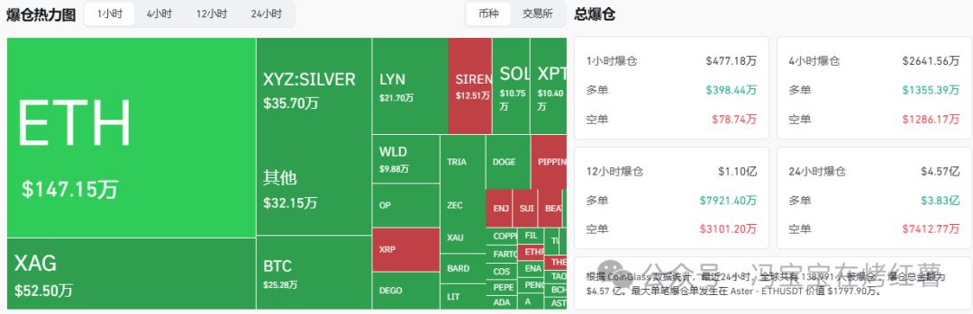 过去24小时全网共有138,991人被被爆仓,爆仓总金额为$4.57亿美元,多单爆仓3.82亿美元,空单爆仓7412.77万美元。