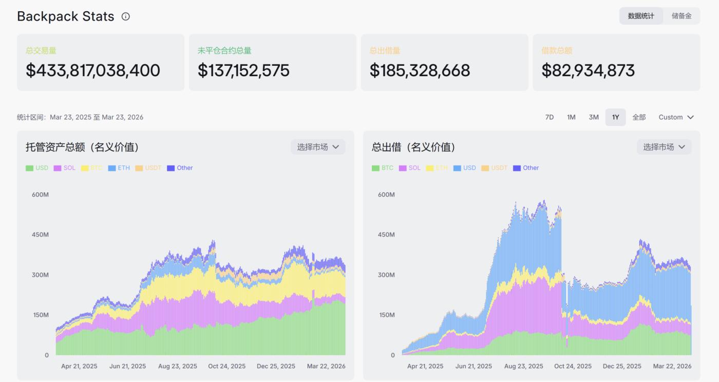 据官网数据显示,目前 Backpack 目前未平仓合约 1.37 亿美元,托管资产名义总价值约 3.5 亿美元,总出借名义价值 3.3 亿美元,其总交易量因空投预期,达到 4.33 万亿美元。