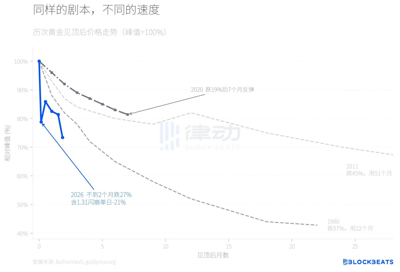 2026 年的回调目前跌幅在 27% 左右,已经超过 2020 年,正在接近 2011 年。但看速度,它是四次中最快的。