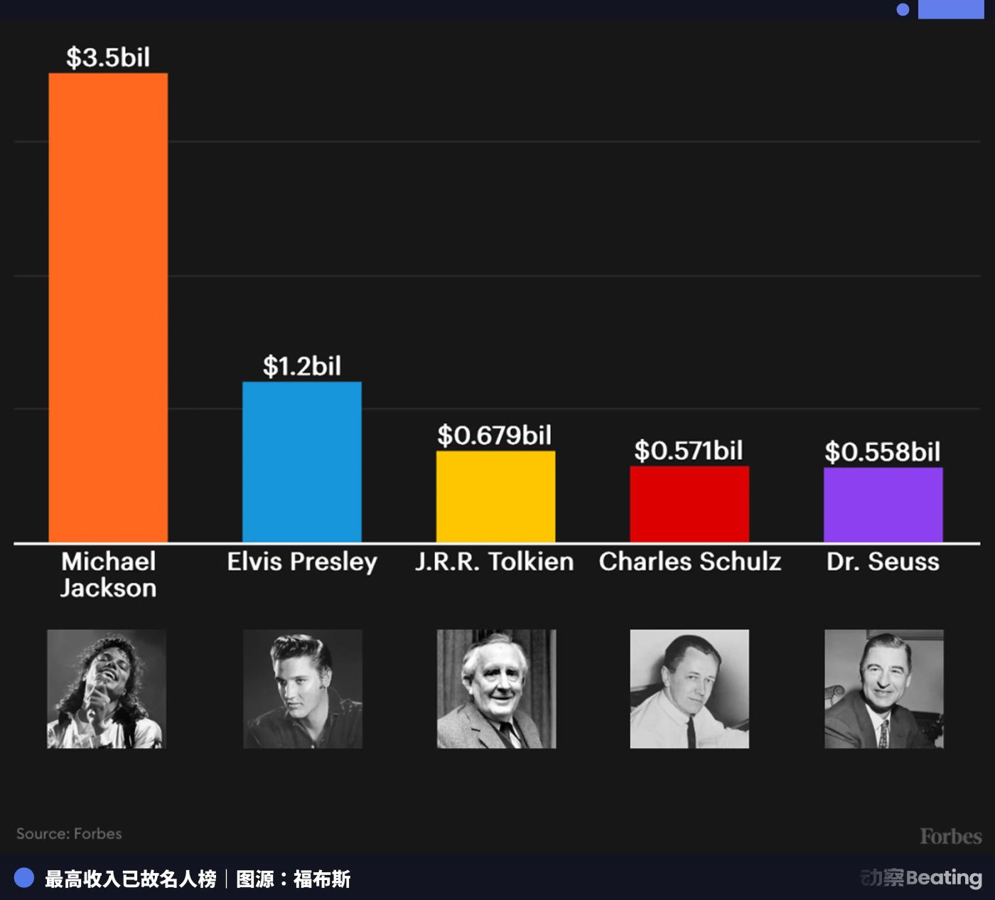 根据福布斯发布的「最高收入已故名人榜」,迈克尔·杰克逊等巨星每年死后依然能创造数亿美元的收入。但在过去,这种「死后经济学」靠的是版权授权,比如卖录音带、卖周边、办致敬音乐会。遗产公司只是在收租,吃的是明星生前积累的存量。