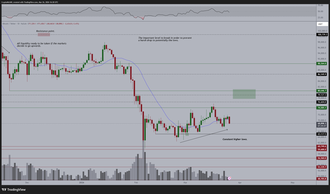 很明显,在 75000 美元遭遇阻力后,市场没有足够的力量继续走高。