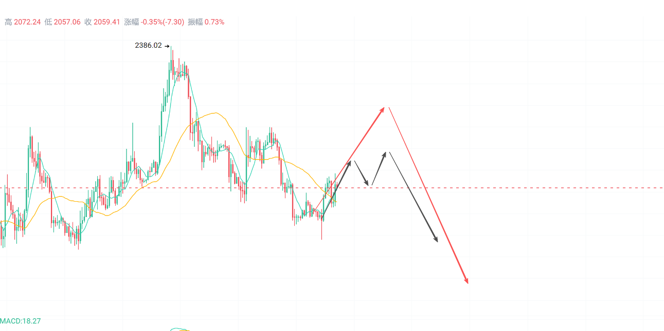 ETH这边,从1748起来的反弹已经走了50多天,基本进入尾声阶段。接下来就两种走法:要么短期再冲一波新高(配合BTC冲76K),要么直接进入回调结构,一旦出现深度回踩或跌破关键位,基本宣告反弹结束,重新转弱。尤其是1938这个位置,一旦有效跌破,大级别下行就很难避免。
