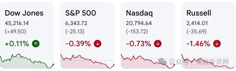 到收盘,道指上涨 0.11%;标普 500 下跌 0.39%;纳指下跌 0.73%;罗素 2000 下跌约 1.5%。