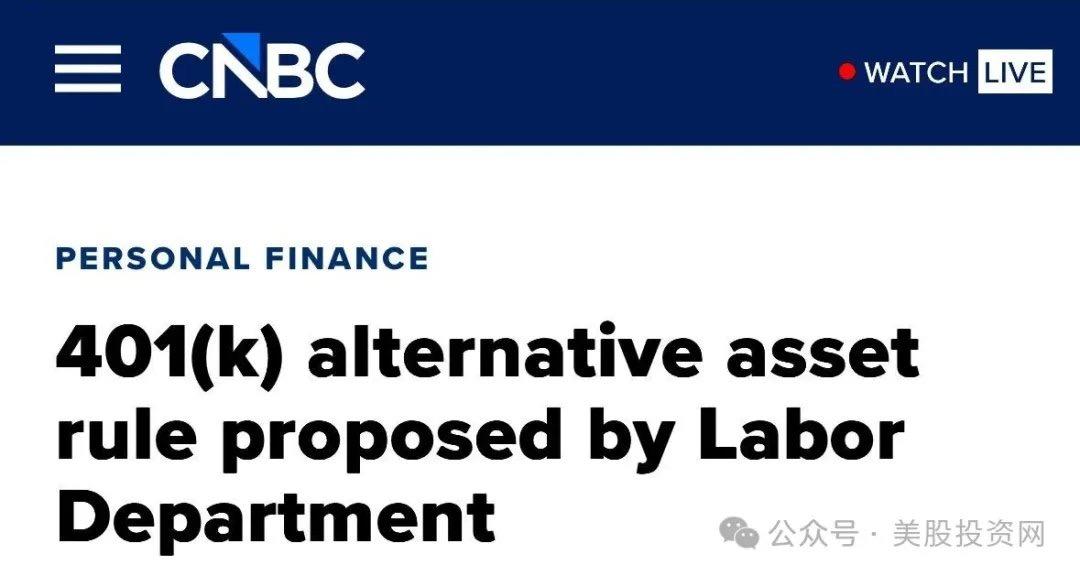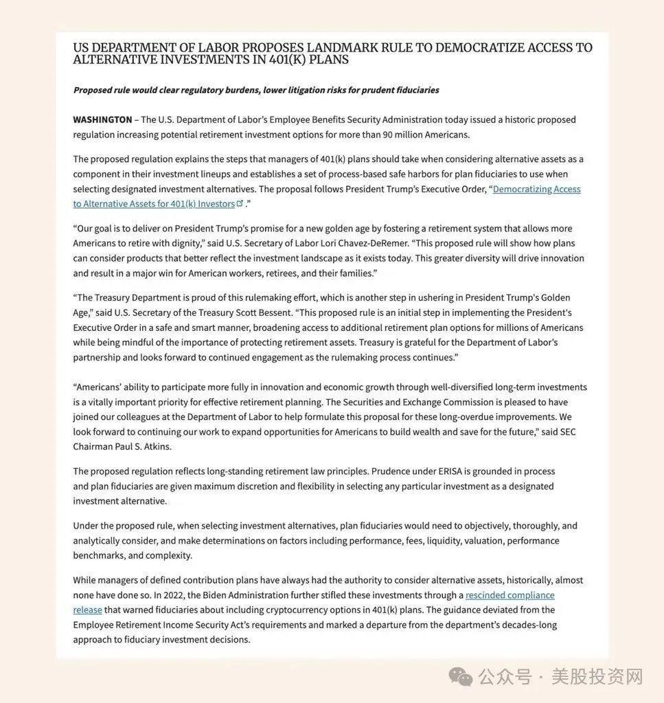 相对亮一点的方向,在金融板块(收涨 1.1%)。其核心驱动力来自美国劳工部发布的重磅指引草案 —— 明确受托方可向 401 (k) 退休计划中加入另类资产。(这一政策敞口未来也有望惠及 Bitcoin 等资产)。