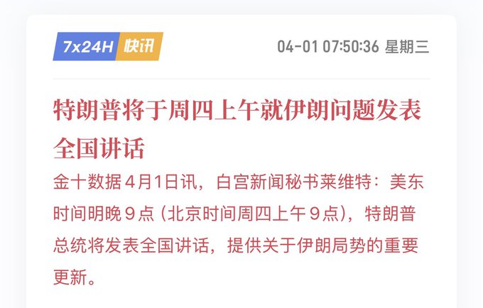 但对川普开始准备赢学叙事这点也需要重视,今天上午9点,川普将发表全国讲话,提供关于伊朗局势的重要更新。看看他会如何表态