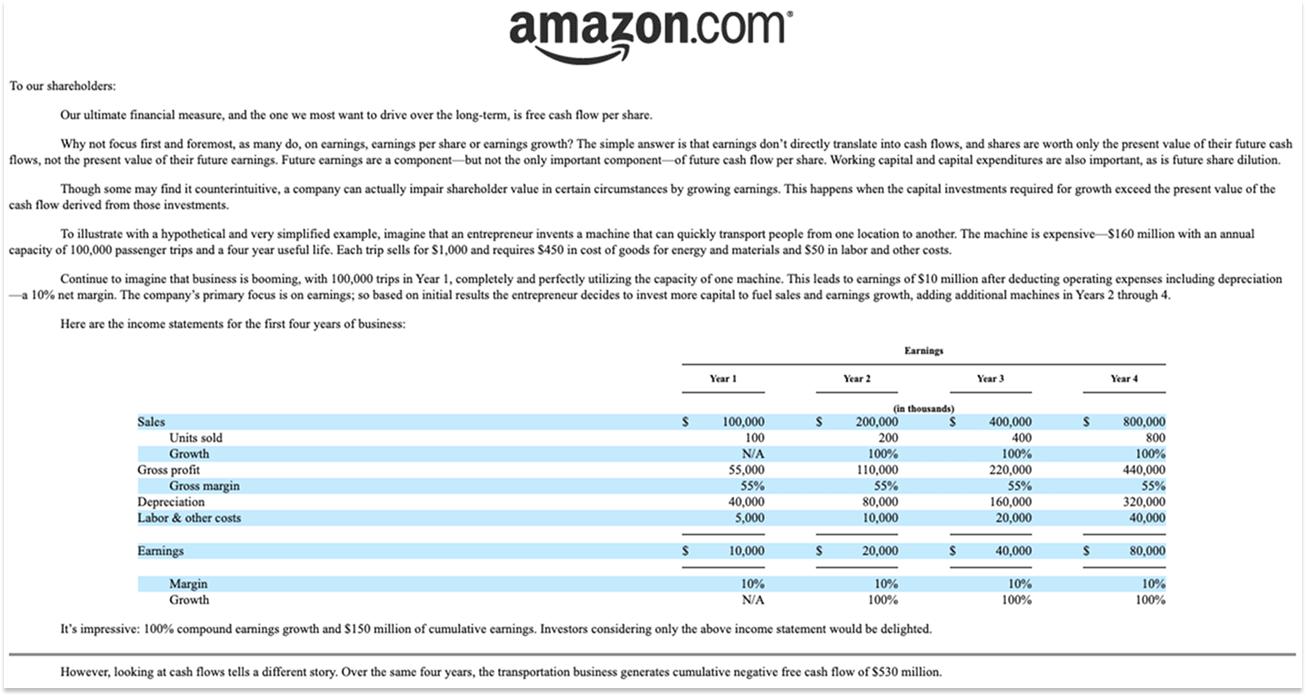 杰夫·贝佐斯是一位具有时代特色的企业家,他出身于对冲基金,经过深思熟虑,他宁愿短期亏损,也要在长期内赚取更多利润。在他1997年致股东的信中——这是他作为上市公司首席执行官的第一封信——他明确阐述了他愿意做出的权衡:“如果必须在优化GAAP会计报表和最大化未来现金流的现值之间做出选择,我们会选择现金流。”