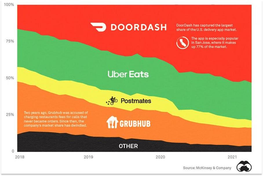 然而,用Uber做类比——字面上的类比,例如「X 领域的 Uber」——却让那些失败的创业公司得以继续生存。唯一一家可以被称为“X 领域的 Uber”的成功公司是 DoorDash,它的成功正是源于团队研究了 Uber,发现“这里面有值得挖掘的东西”,然后根据实际情况进行了调整。他们没有选择在人口密集的城市市场竞争,而是将这种模式应用到了服务不足的郊区。在这些地区,竞争较小,获客成本更低,平均订单价值更高,用户留存率更高(因为选择更少),取货和送货也更方便(商店和住宅都有车道和停车场)。然后,正如Dan Hockenmaier所说,他们坚持不懈地执行:「他们每周都让配送速度更快、更可靠一些。他们严格审查每一家合作餐厅和每一位送餐员的服务品质。他们优化了系统成本,并将节省下来的成本以 Dashpass 的形式返还给用户(Dashpass 于 2018 年推出,即本图表开头部分)。」本图表开头部分)。」本图表开头部分)。