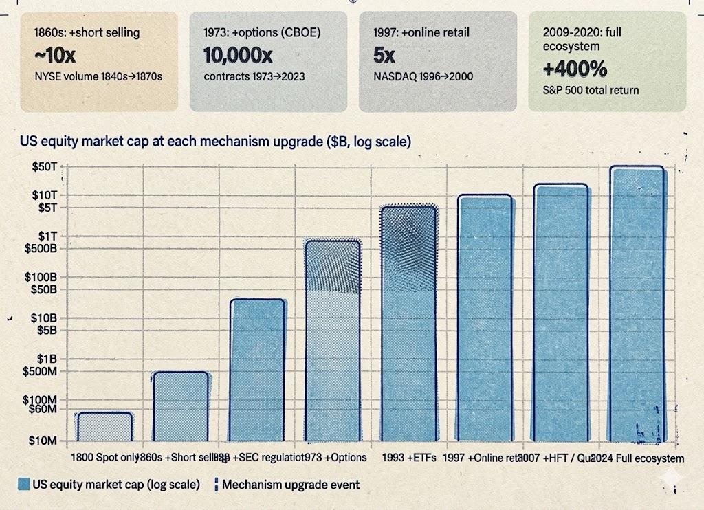发生了什么?和 1860 年代华尔街引入做空后一模一样的事:流动性暴涨,价格发现变得双向,波动率结构性下降。