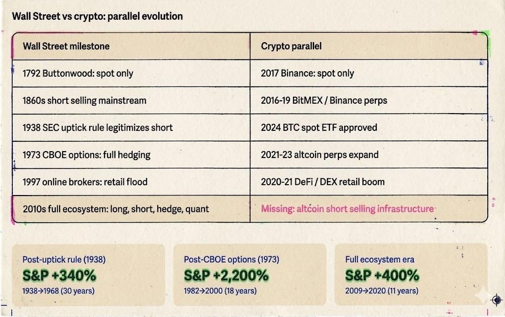 这和历史上每一次做空机制的诞生路径一致。1609 年 le Maire 的做空不是阿姆斯特丹交易平台批准的。1850 年代华尔街的融券做空不是 NYSE 设计的。它们都是市场参与者自发创造的——先有工具,后有规则。SEC 在 1938 年做的事不是发明做空,而是给已经运行了近百年的做空行为建立规则框架。