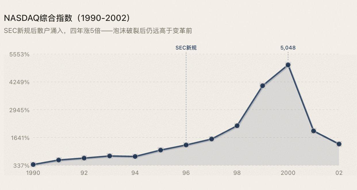 NASDAQ 从 1971 年成立起就是电子交易平台——人类历史上第一个。真正在 1996-1997 年发生的变革是两件事:SEC 的 Order Handling Rules 打破了做市商对报价的垄断;在线券商(E*Trade、Ameritrade)把交易佣金从 50-100 美元压到了 10 美元以下。