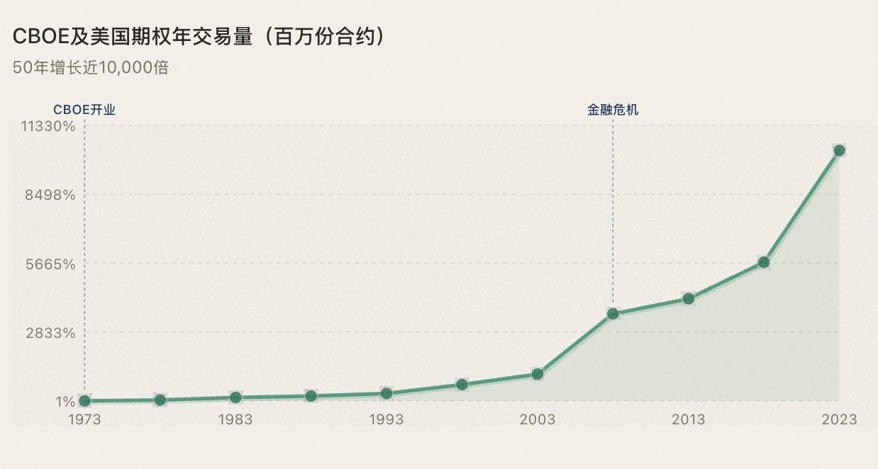 1973 年 4 月 26 日,芝加哥期权交易所(CBOE)开业。第一天只能交易 16 只股票的看涨期权(Call)。看跌期权(Put)1977 年加入。同年,Fischer Black 和 Myron Scholes 发表了改变金融史的 Black-Scholes 期权定价模型,为期权交易提供了数学基础。
