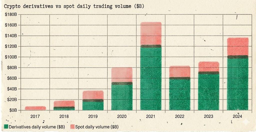 衍生品占总交易量比例从 2017 年的不到 10% 上升到 2026 年 3 月的约 90%——衍生品已经彻底主导了加密市场的定价权:
