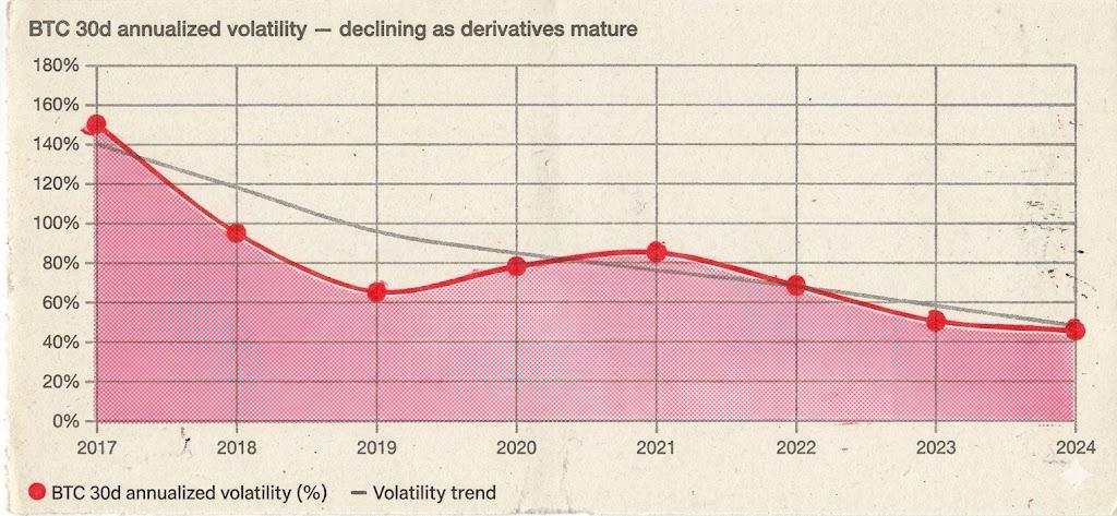 1860 年代做空普及后,NYSE 交易量十年增长十倍,华尔街从小圈子变成真正的资本市场。1938 年 uptick rule 合法化做空后,机构资金大规模入场,S&P 500 在随后 30 年里上涨 340%。1973 年 CBOE 期权诞生后,期权交易量 50 年增长 10000 倍,美股迎来数十年的持续扩张。2019 年 BTC 永续合约上线后,BTC 波动率从 150% 降到 50%,市值却从 100 亿美元膨胀到 2 万亿。