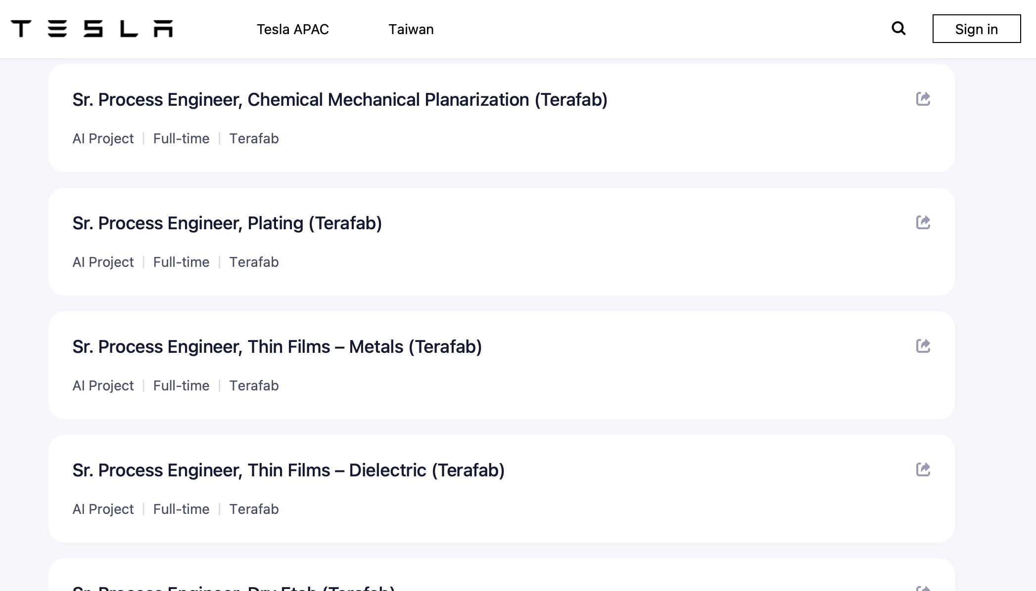 Terafab 台湾职缺全部挂「资深」,最低要求 5 年先进制程经验,部分职位要求 10 年以上,并明示需要 7nm 以下甚至 2nm 制程实战经验。以下是完整清单: