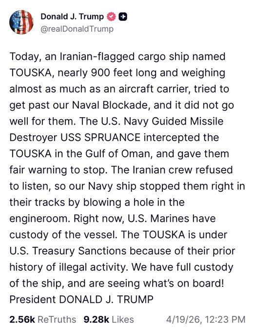 川普总统称,美国在阿曼湾袭击并扣押了一艘悬挂伊朗国旗的货船。 美国在阿曼湾拦截了一艘名为「图斯卡」号的船只,并发出停船警告。该船拒不服从停止令,随后遭到砲击。 美国海军陆战队现已控制该舰。图斯卡号已被列入美国财政部制裁名单。