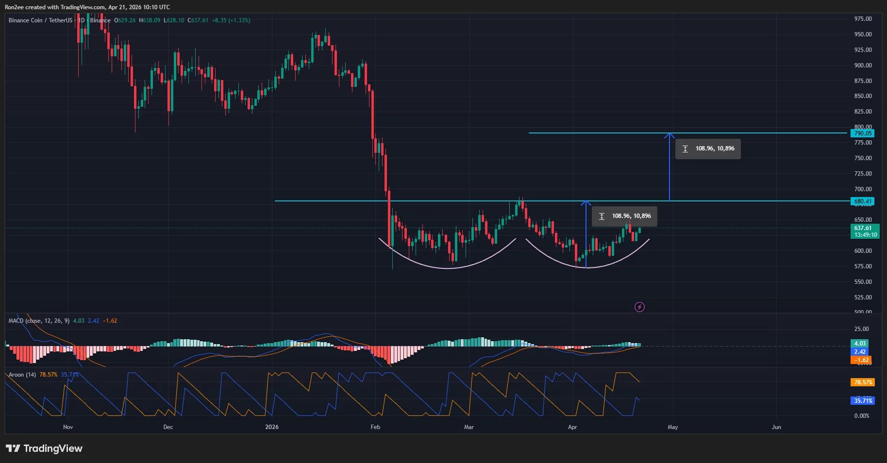 从日线图来看, BNB价格在过去三个月里形成了一个看涨的双底形态。该双底的颈线位于680美元。