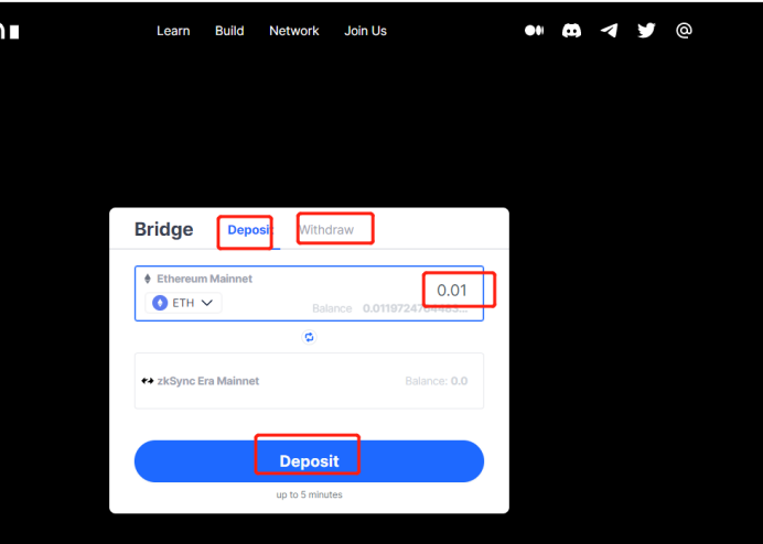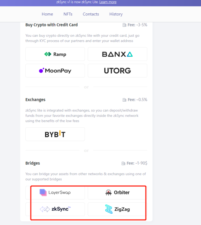 1. 利用top up 进行跨链,从以太主网到zk lite.跨链桥有四种:https://lite.zksync.io/account/top-up 常用官方和orb跨链,至少要用一次官方桥,orb跨链桥也要使用下。下面几个交易的链接都可以从官网上进入