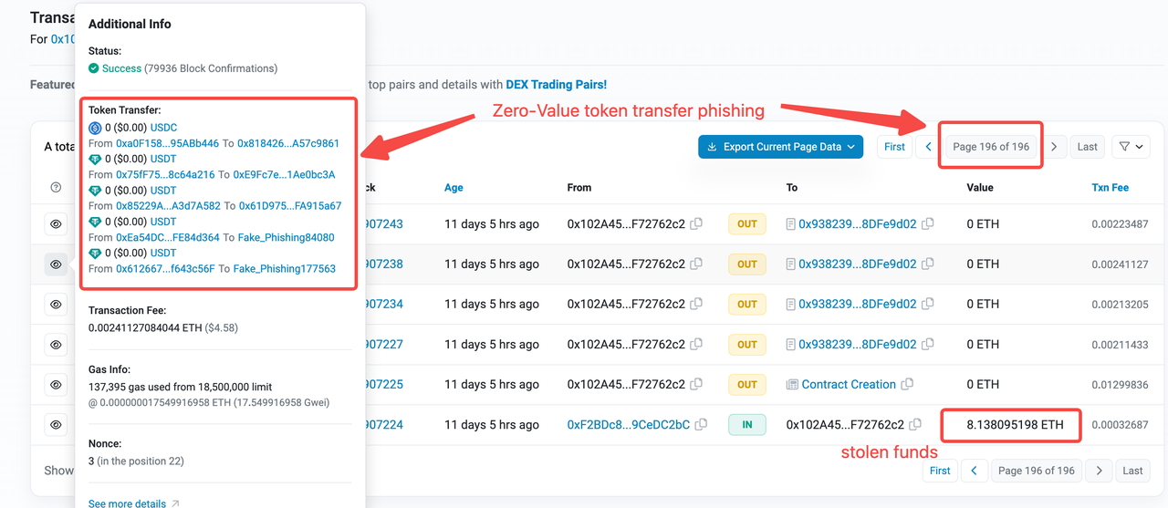 从2022年11月开始,链上出现了一种新的钓鱼方式。攻击者构造与正常交易的预期接收者相似的地址,然后向链上用户发送大量值为零的虚假代币转账数据。这使他们能够从错误的交易中获利。