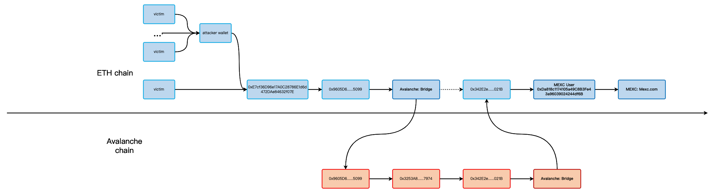 三、洗钱。例如,攻击者将130个ETH转入Avalanche,然后通过多跳转回ETH,最后兑换成USDT,洗入MEXC提现。 MEXC用户充值地址为0xDa818c1174105a49C8B3Fe43a96039024244df6B 。