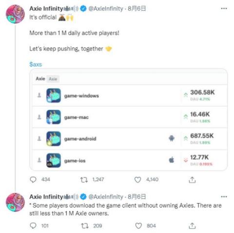 Axie21 年 8 月日活 100 万,2022 年第四季度链游的总钱包日活 80 万