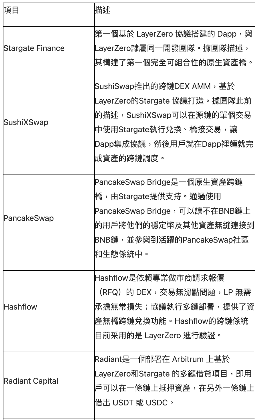 LayerZero 创新的技术加之更快的部署速度和一定的成本优势,以及早期著名VC 和社群具有影响力KOL 的推动,使得LayerZero 生态在短短一年左右的时间内得到了快速的扩张,并且在DeFi、NFT 和稳定币等方向都取得了不小的成绩。截至目前,已有50+ 项目(含未正式推出/上线的项目)集成或正在使用LayerZero 技术。详情如下(仅列举部分):